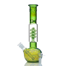 Glow up your glass game with the Fumed Spiral Perc Beaker by Cheef Glass! Color-changing glass with a spiral perc will add the perfect touch of pizzazz to any session. This sturdy piece features a diffused downstem and a studded neck for a smooth, bubbly sesh.